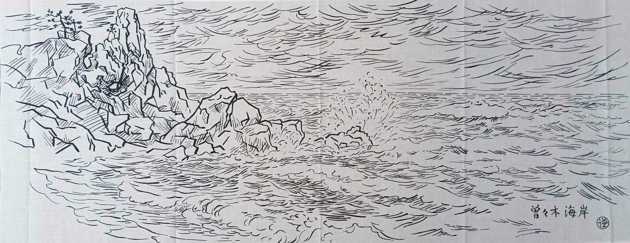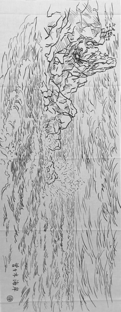偶然にも地震発生のわずか一ヶ月前に、曽々木海岸を訪れてスケッチをしていました。能登復興の願いを込めて、そのとき写しとった窓岩のある曽々木海岸の風景を手拭いに仕立てました。心の拠りどころ、能登の応援になれば幸いでございます。