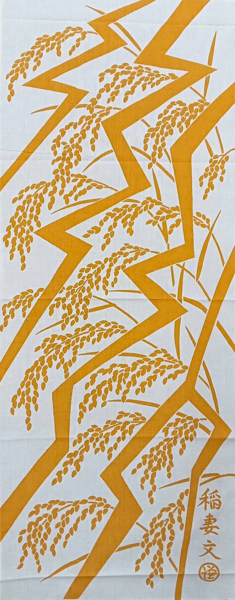 稲妻文は、自然の力強さやエネルギーを象徴する加賀友禅独特の文様です。雷は空気中の窒素を雨に含ませ、稲の生長に役立つところから、雷の閃光を「稲妻」と呼ぶそうです。石川県は雷が多い米どころ、大いなる自然のパワーでたわわに実った稲穂の様子を表した作品です。