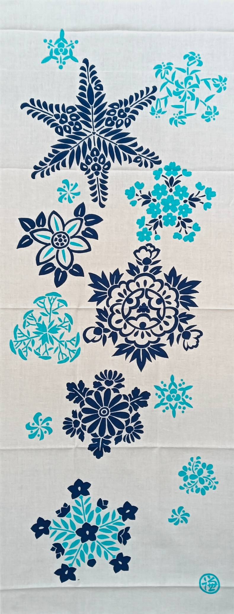 加賀友禅の「雪花文(せっかもん)」は、雪の結晶や雪の花をモチーフにした文様です。雪は古来「豊年瑞兆」つまり豊作の前触れとされ、吉祥文様として扱われます。季節の花々を雪のように降らせました。一枚の手拭いの中にどんな花が描かれているのか、じっくり探してみてください。